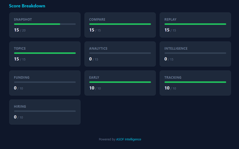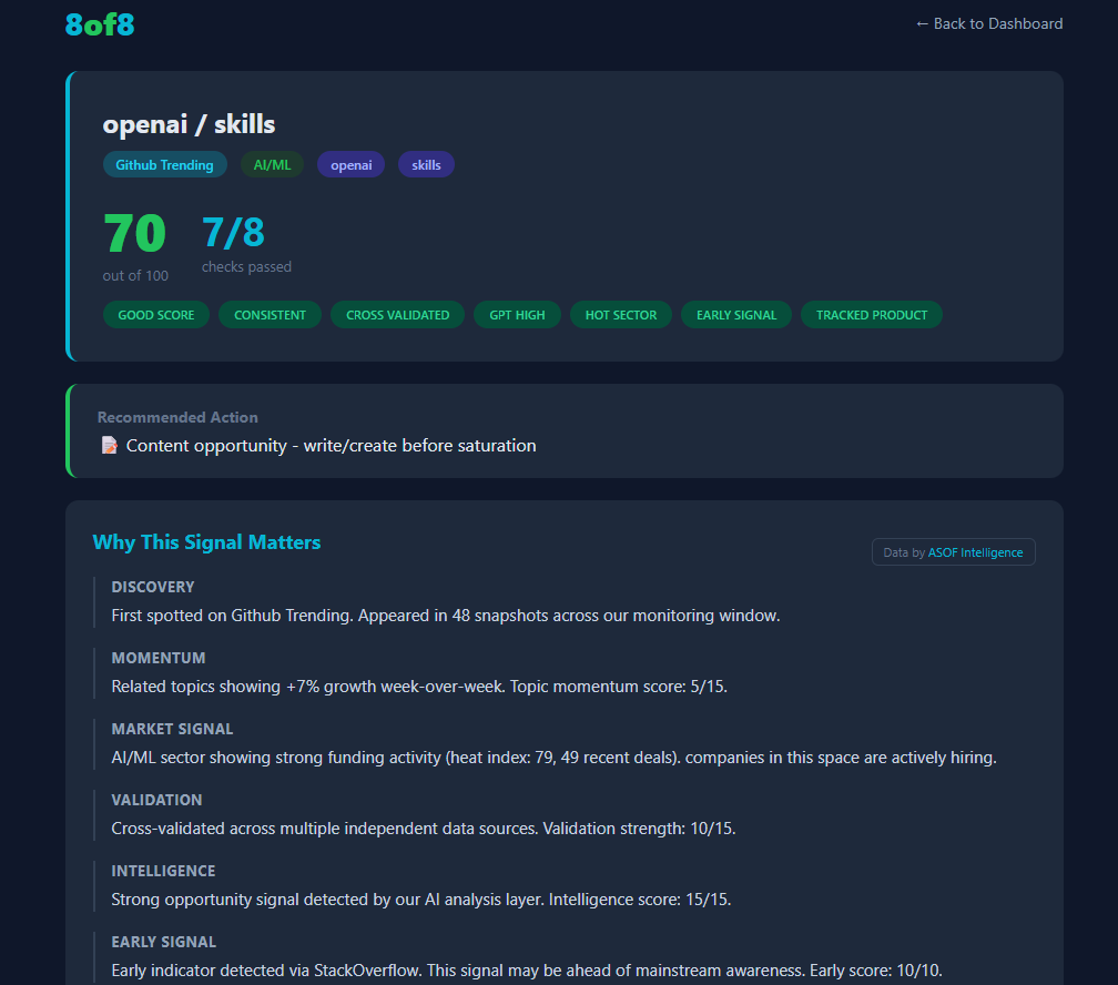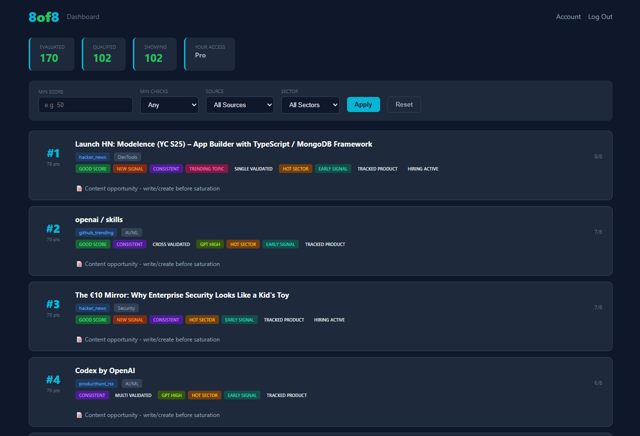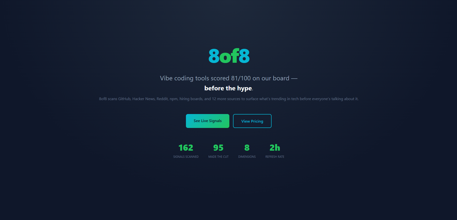 8of8 scans 17 data sources every 2 hours — Hacker News, GitHub, Reddit, npm, ProductHunt, hiring boards, funding filings, Wikipedia, VC blogs, and more — and scores every signal 0-100 across 8 dimensions. Instead of scrolling 10 platforms to figure out what's trending in tech, you get one dashboard with 120+ scored signals. Free tier shows all signals and scores. Pro ($29/mo) unlocks detailed breakdowns, AI intelligence reports, and email alerts.