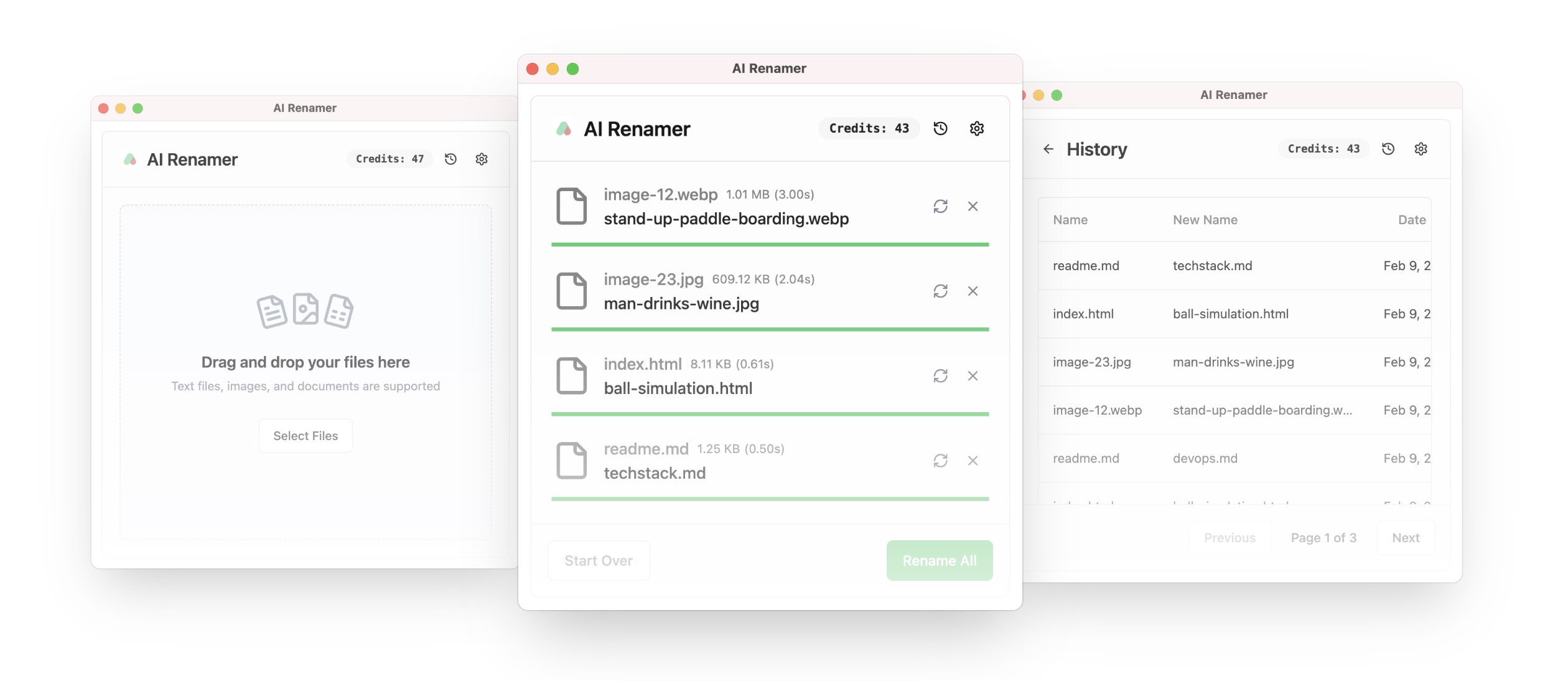 AI Renamer helps you rename files in a smarter way by analyzing their content. It supports image formats (JPG, PNG, WEBP, GIF), document types (TXT, HTML, JS), and PDFs. Choose between local mode (one-time license) or cloud mode (credits-based). Drag and drop files or folders, select your preferred AI model, and watch as your messy filenames turn into something clear and useful. Use the custom instructions feature to define exactly how you'd like files to be named. AI Renamer supports bulk file renaming and works on both Mac and Windows. Start now with 10 free credits 👉 airenamer.app
