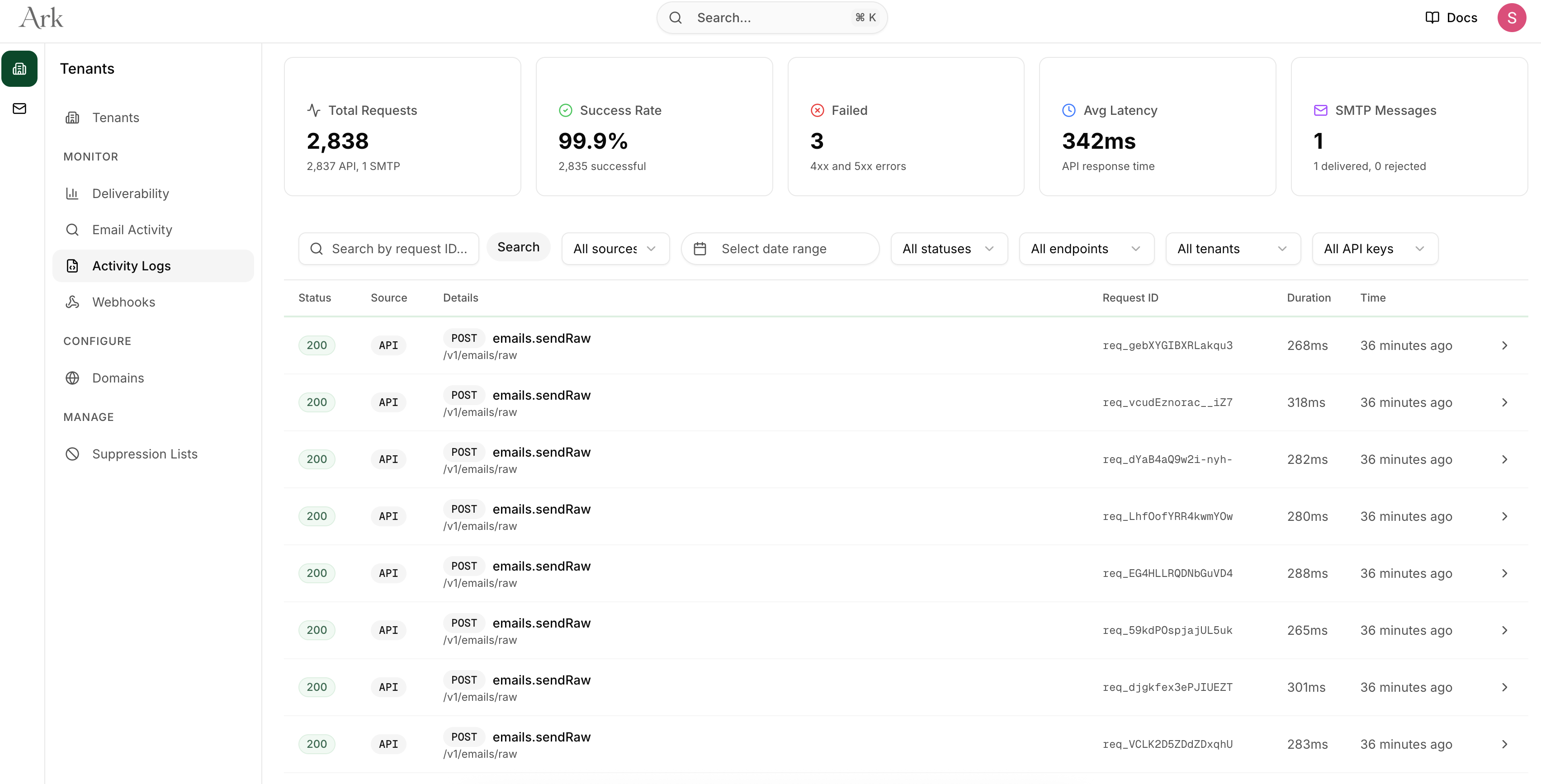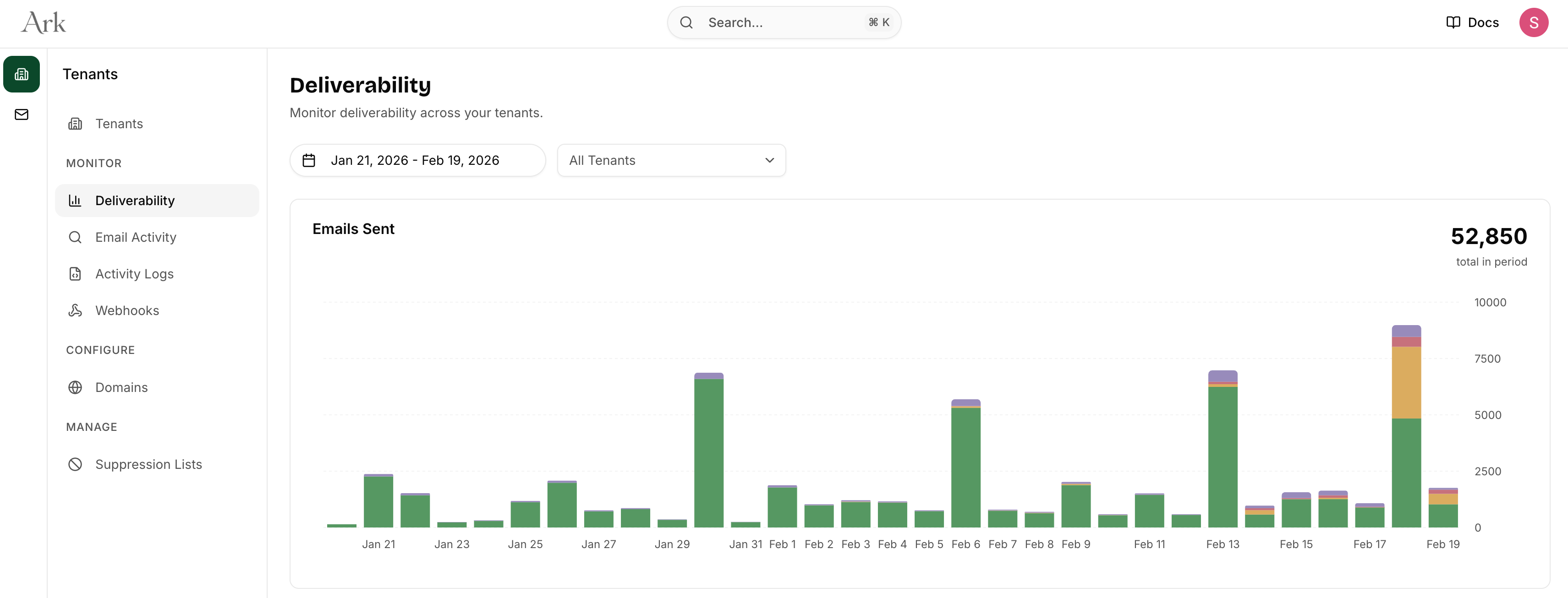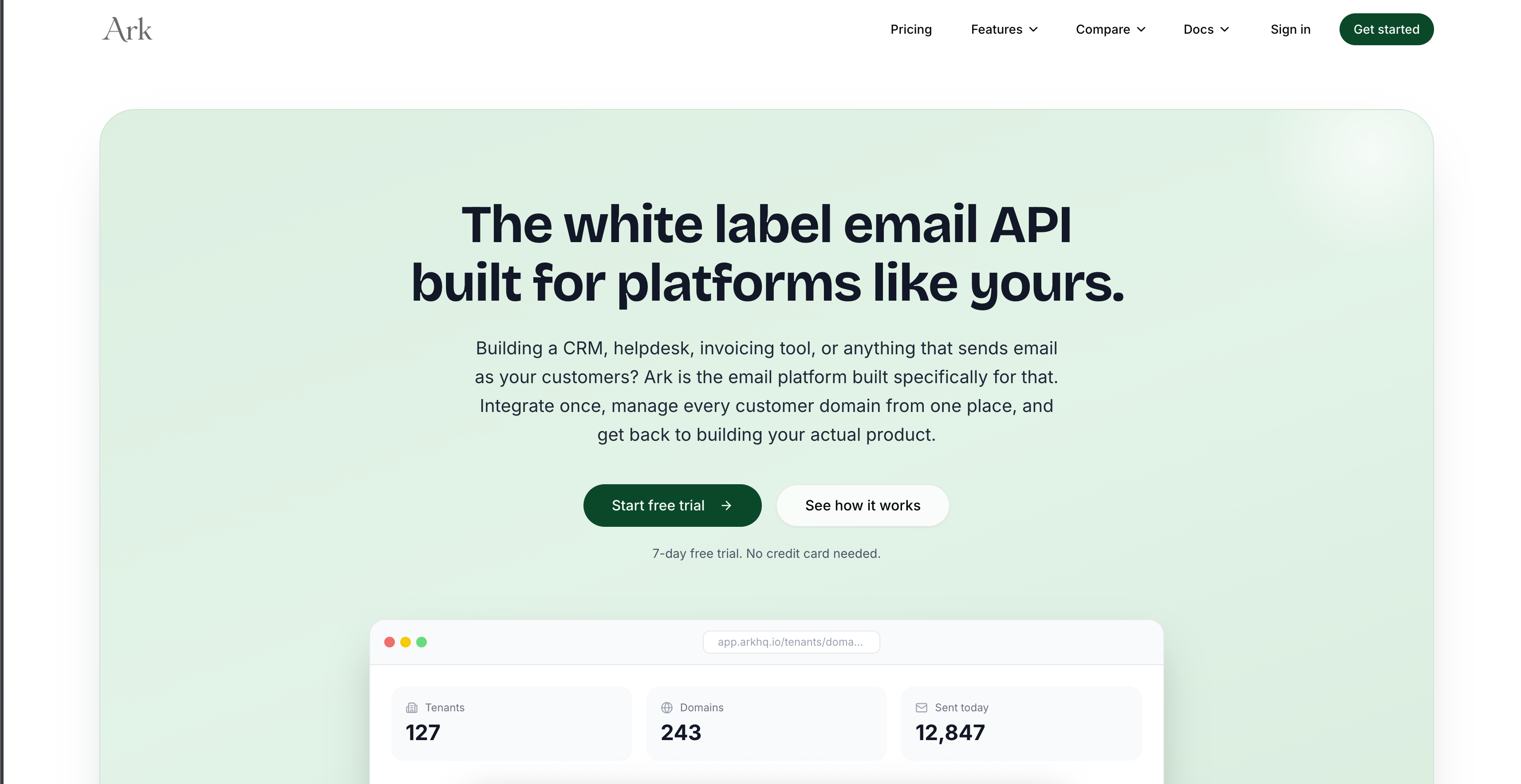Ark is a white label email sending API and SMTP relay for SaaS platforms. Your customers send from their own domains with automatic SPF, DKIM, and DMARC — one integration, thousands of customer domains, full reputation isolation.