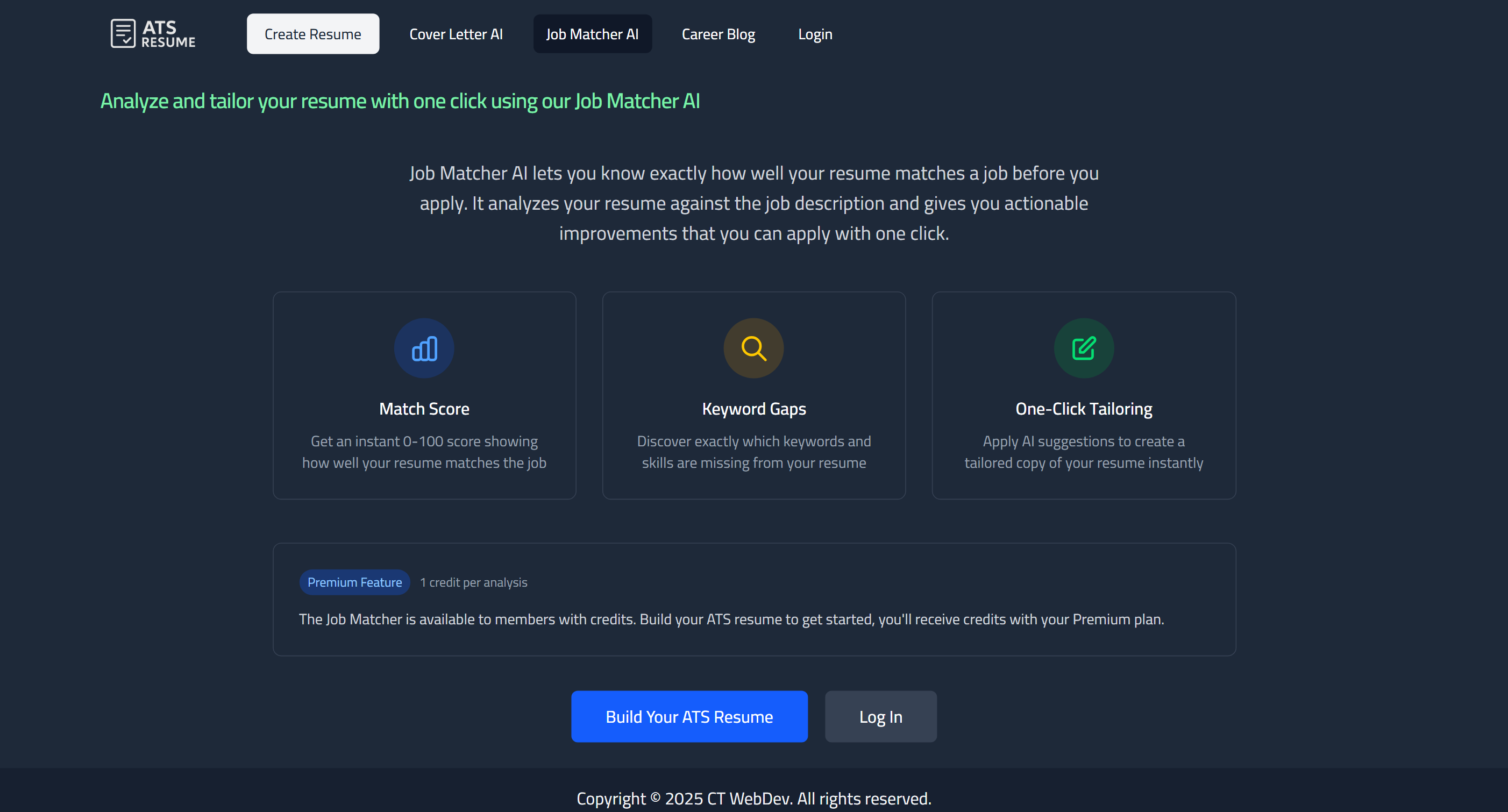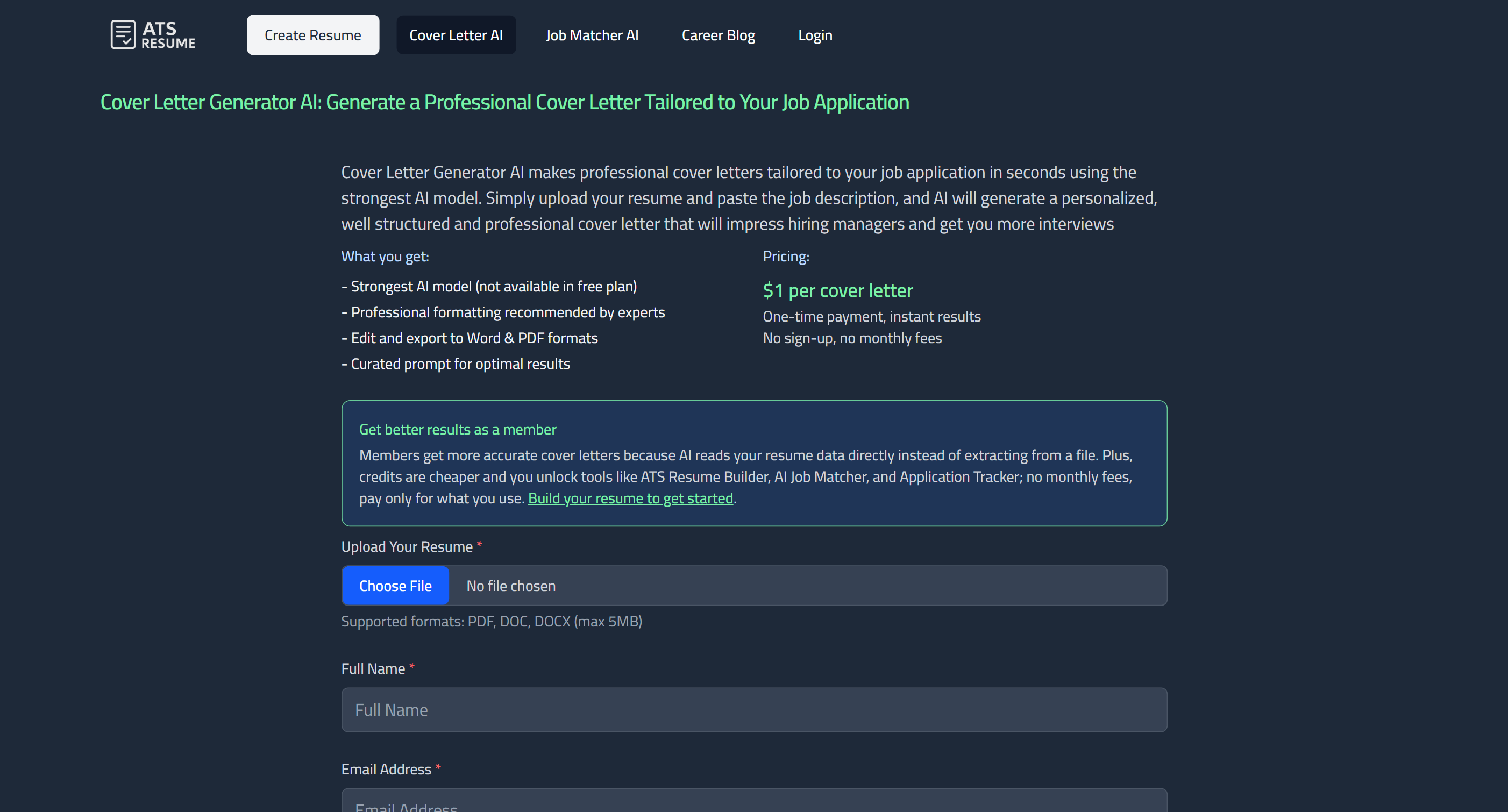75% of qualified job seekers get eliminated by ATS due to readability issues, don't be one of them! Create an ATS-friendly resume designed to pass applicant tracking systems, get more interviews and land your dream job. No signup required, no subscriptions, just a simple form-based process that only takes 5 minutes. Use our AI Job Matcher to tailor your resume to perfectly match the job application Features 100% ATS parse rate, tested and confirmed on real ATS software. Professional structure designed by recruitment experts. No signup required and no monthly fees. Quick and simple form-based process: build your resume in 5 minutes. Get access to useful AI tools: cover letter generator, job matcher and applications tracker.