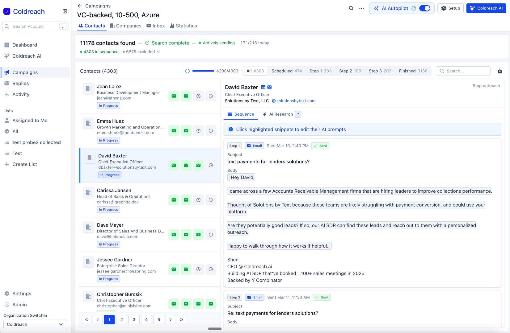 Coldreach is an AI SDR agent that researches every lead's online presence to identify pain points, status quo, and in-market status. This deep research powers highly personalized email & LinkedIn outreach and automated follow-ups. The result: timely, relevant outreach that gets responses, boasting a 3.8% average reply rate (10x industry average) thanks to a deliverability setup that avoids spam.
