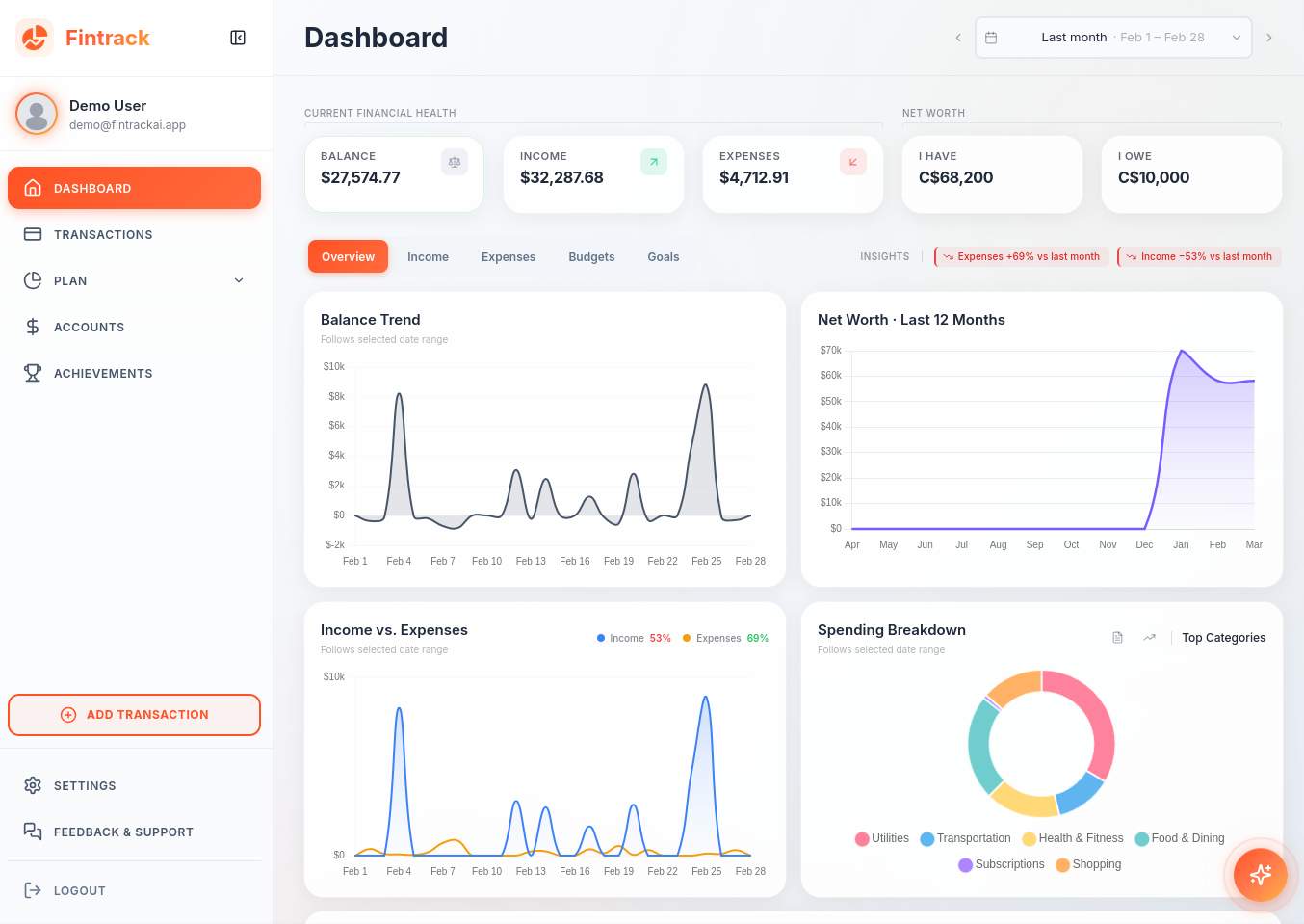 Fintrack is an AI-powered personal finance platform helping individuals and households manage their money. It offers smart transaction tracking, automated categorization, budgeting, and goal tracking. Its AI copilot, Finny, understands spending, answers financial questions naturally, provides proactive insights, and gives personalized recommendations. Key features include multi-account aggregation, household sharing, credit card rewards tracking, and rich analytics.