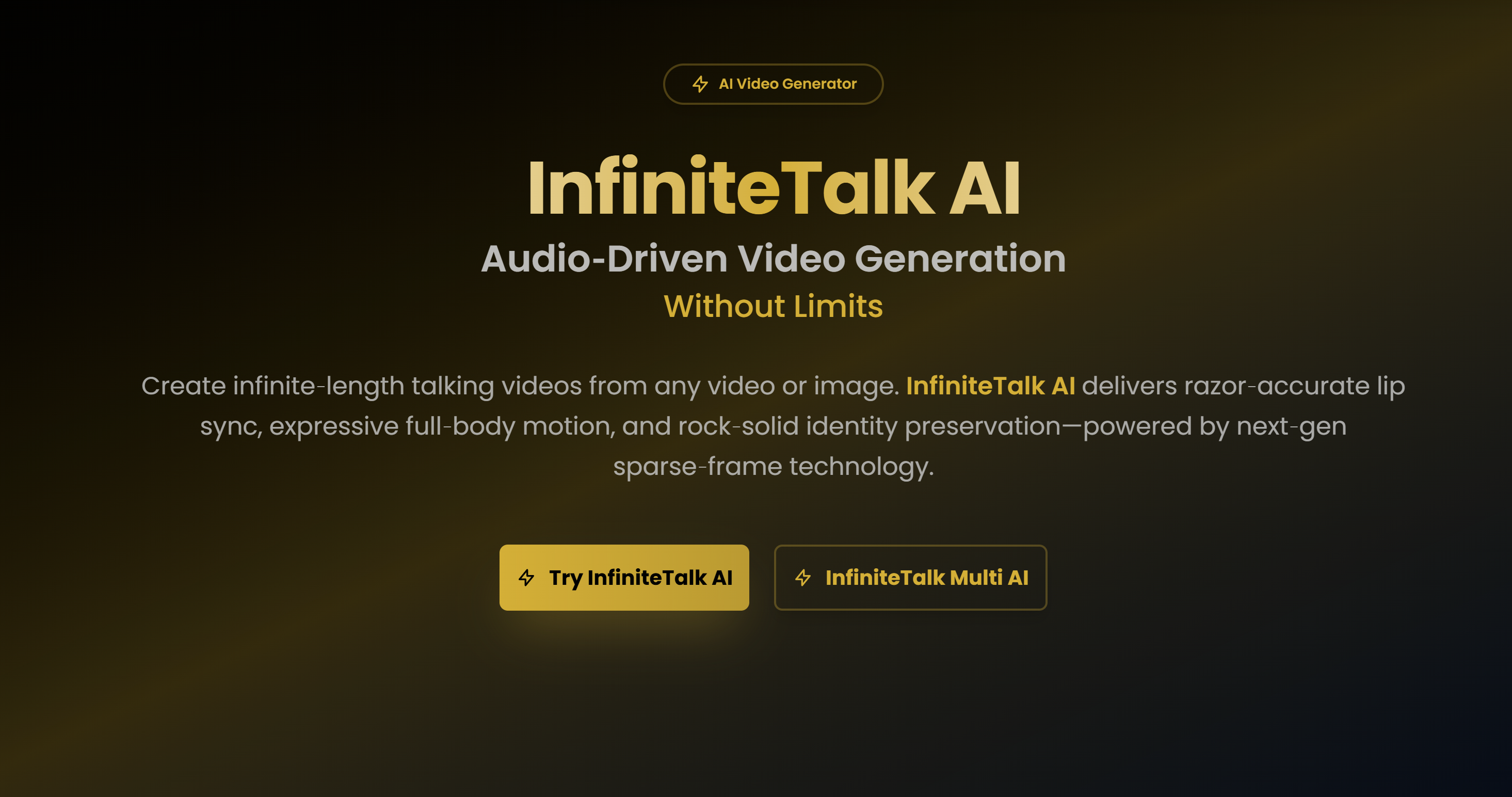 InfiniteTalk AI: audio-driven full-body video dubbing that preserves identity and camera motion, with sparse-frame control and long-sequence image-to-video.