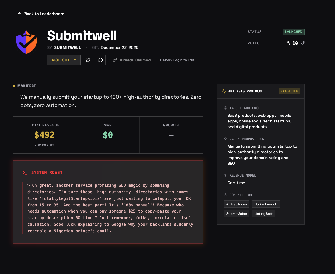 Another startup launch directory but with a twist: - Get roasted by AI - Compete in a leaderboard - Get free no-follow backlink - Share product updates in public