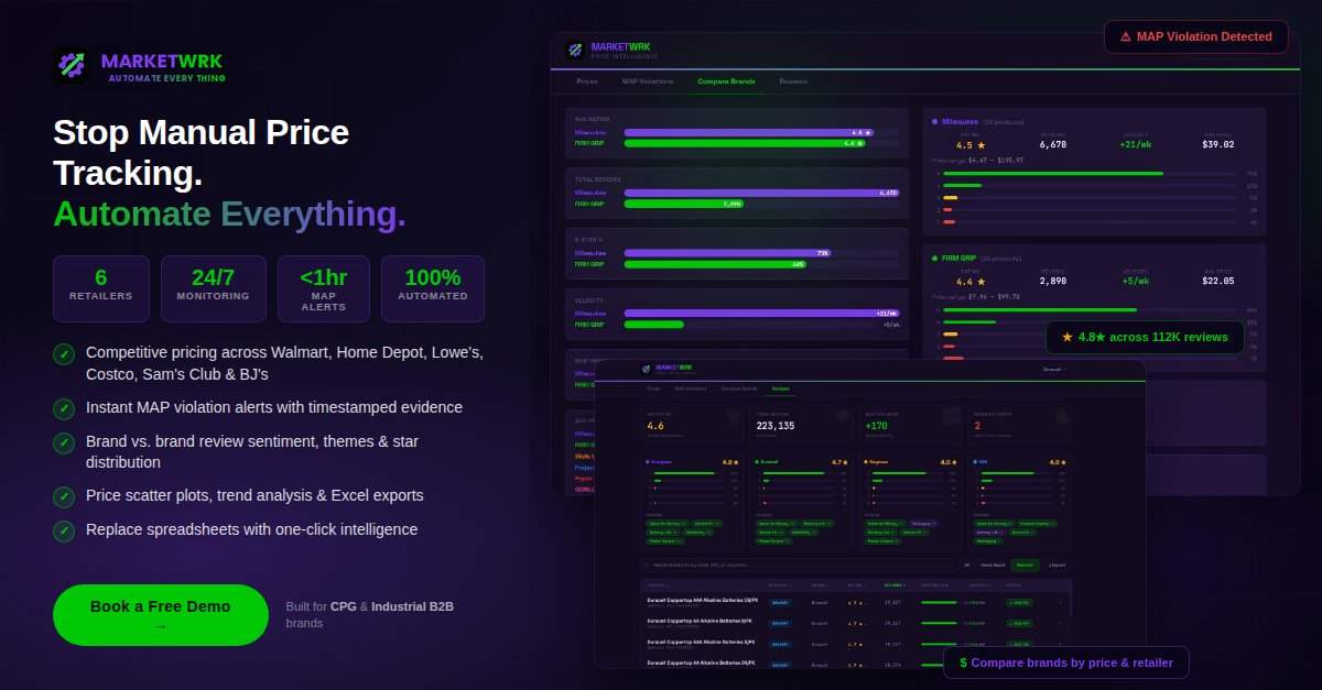 MARKETWRK is a brand platform for CPG/B2B. It automates pricing, MAP detection, review monitoring, and brand comparison across major retailers. Brands track zip-code pricing, get daily MAP alerts, monitor AI review sentiment, and benchmark products from a single portal with alerts. Get enterprise data affordably, with setup in days. Trusted by national brands like Duracell.