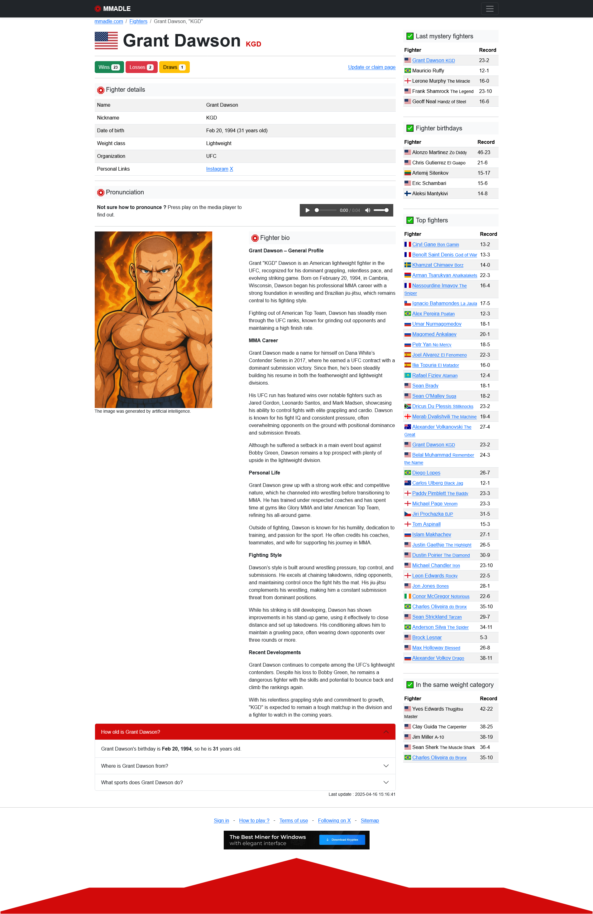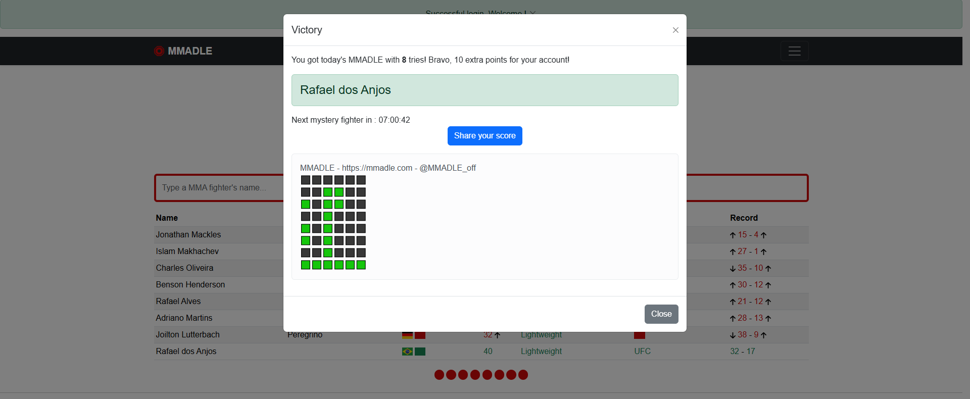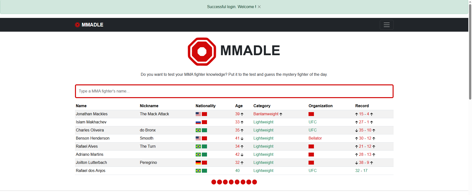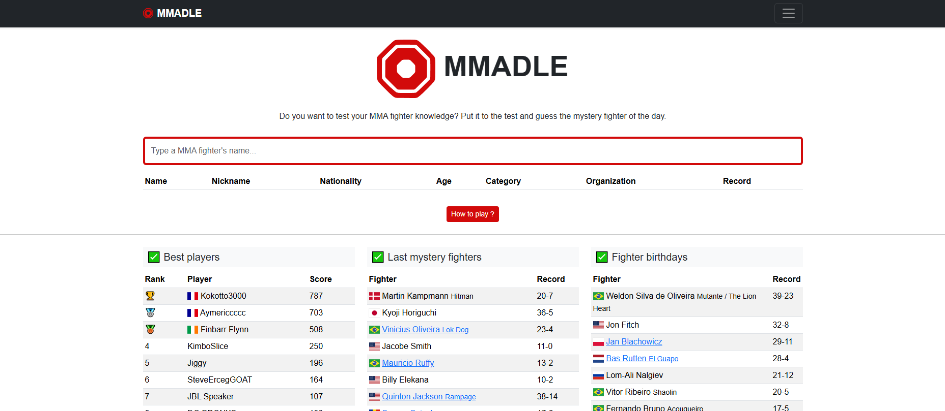 Immerse yourself in the world of MMA with MMADLE, the ultimate game for fight enthusiasts! Every day, a mystery fighter awaits you, and you have 8 tries to guess him. Use strategic clues like age, country, weight class and much more to narrow down your choice. Test your knowledge, challenge your friends and prove you're a true MMA expert. Will you be able to find the fighter of the day? It's up to you!
