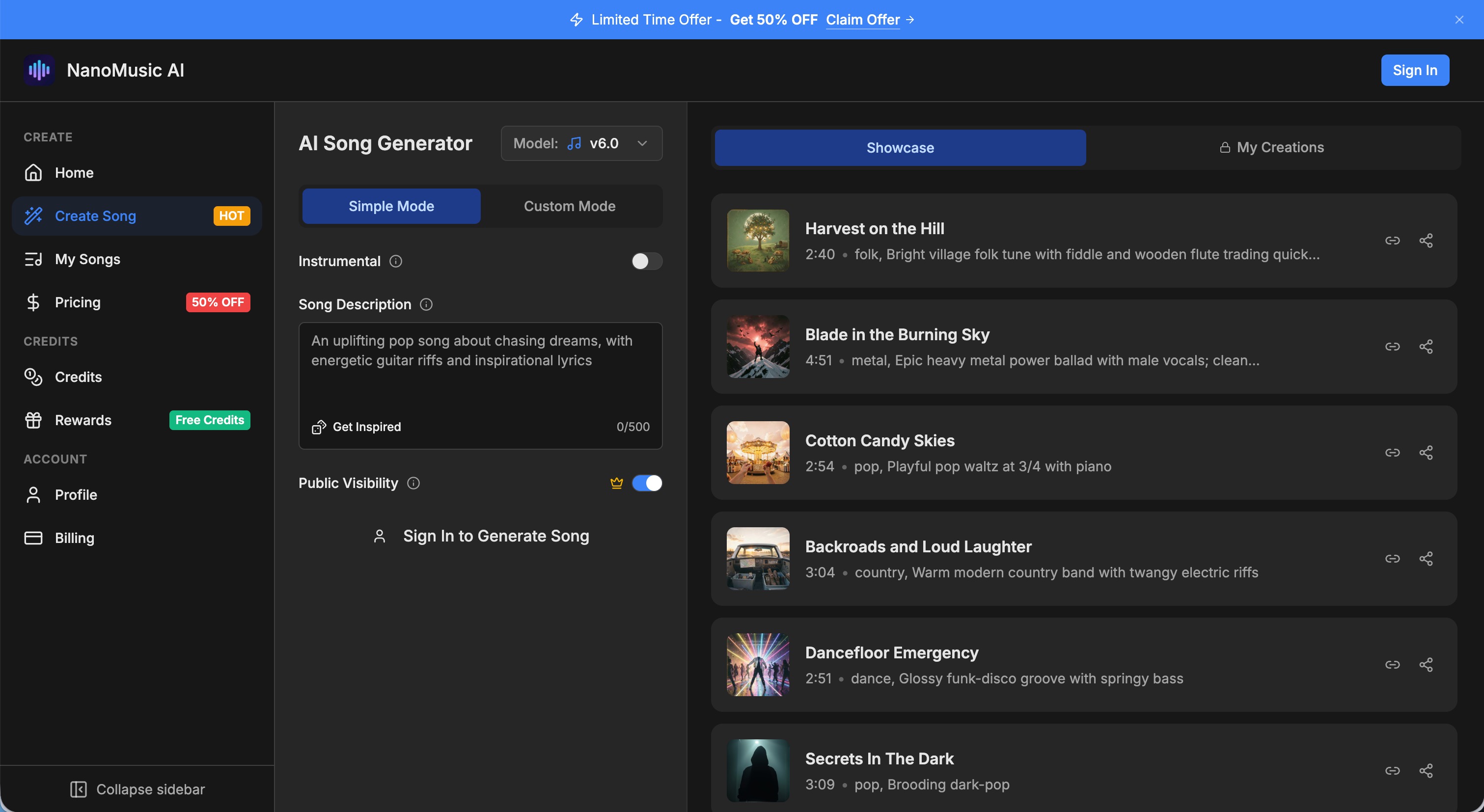 NanoMusic AI is built for people who want to turn ideas into music without the slow, technical process of traditional production. You can type a mood, paste your lyrics, or describe the sound in plain language, and the platform creates an original, publish-ready track in seconds . What makes NanoMusic AI stand out is that it does more than generate background beats. It creates full songs with structure, vocals, harmonies, lyrics, mixing, and mastering, so users get a finished piece that feels ready for release rather than a draft that still needs work . The platform is especially useful for creators who do not have formal music training. You do not need to understand theory, play an instrument, or use a DAW; NanoMusic AI translates simple prompts into music with human-sounding vocals, emotional phrasing, and genre-specific production .