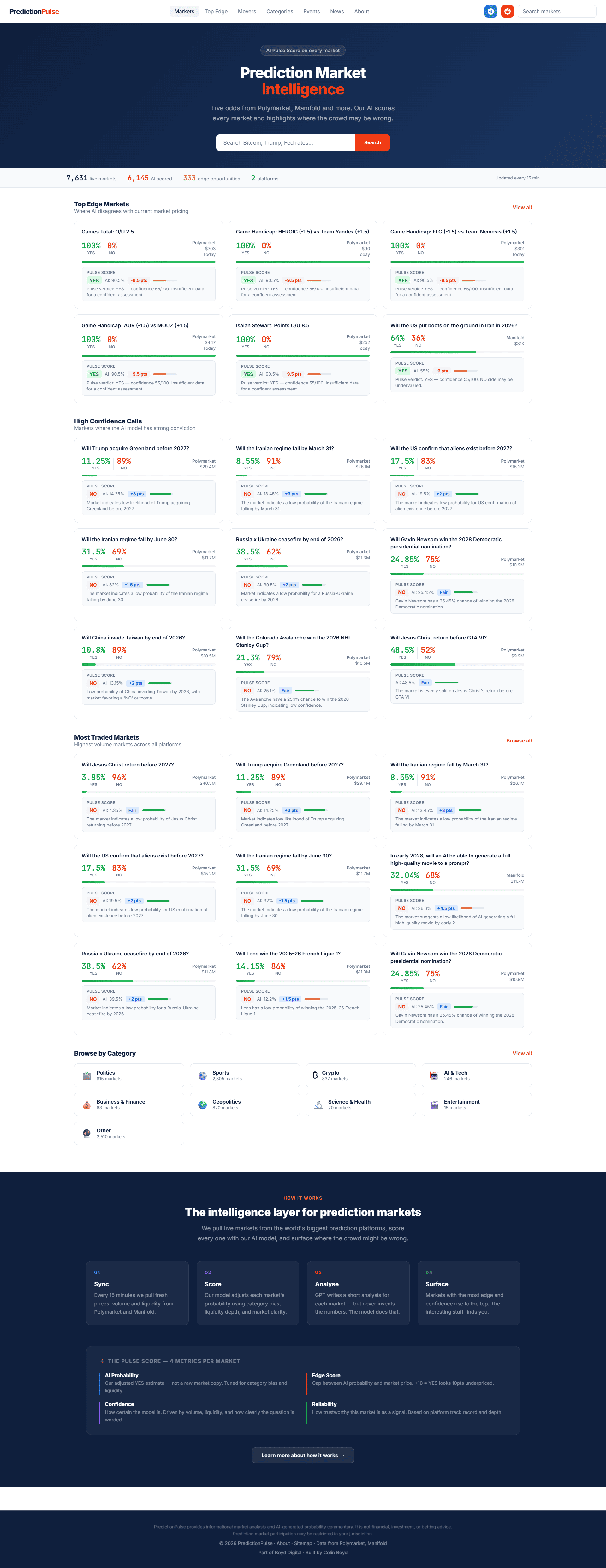 PredictionPulse is an AI platform offering intelligence for prediction markets. It aggregates and groups markets from major platforms into canonical real-world events. Its proprietary Pulse Score AI analyzes thousands of markets, estimating outcomes, spotting mispricing, and explaining resolutions. Users explore events, compare probabilities, and follow AI news. It helps traders and observers understand what prediction markets signal about the future.
