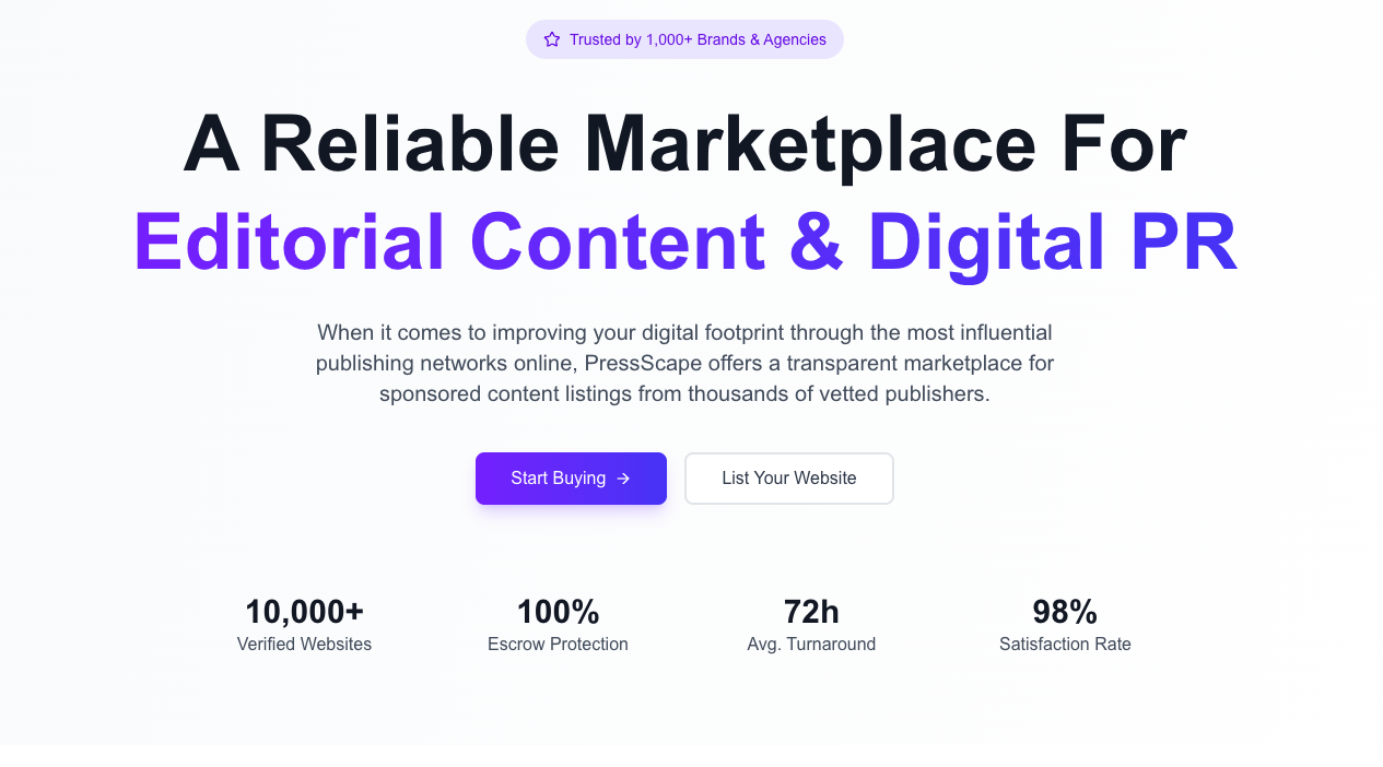 When it comes to improving your digital footprint through the most influential publishing networks online, PressScape offers a transparent marketplace for sponsored content listings from thousands of vetted publishers.