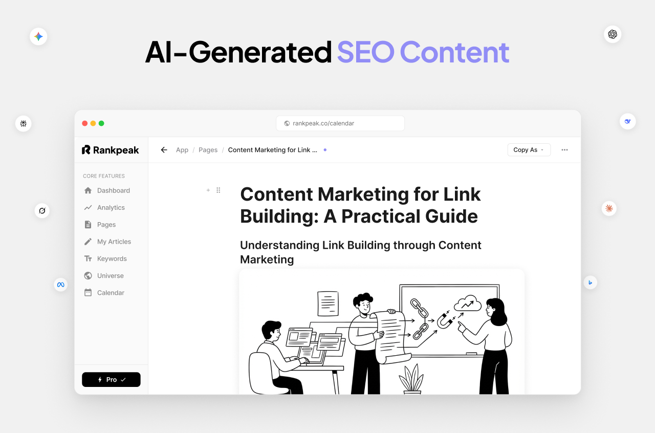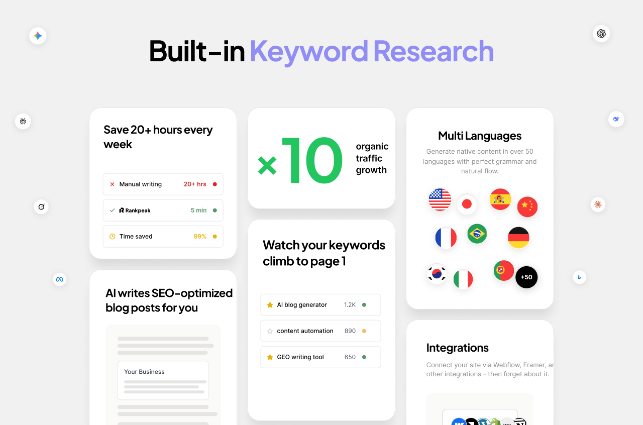 RankPeak is an all-in-one AI SEO platform that replaces expensive agencies and manual workflows. It features a 30-day automated SEO calendar that discovers high-ROI keywords, generates SERP-backed blog posts, and publishes them directly to your site. Beyond traditional SEO, RankPeak is optimized for GEO (Generative Engine Optimization), ensuring your brand is cited as a source in ChatGPT, Claude, and Perplexity results.
