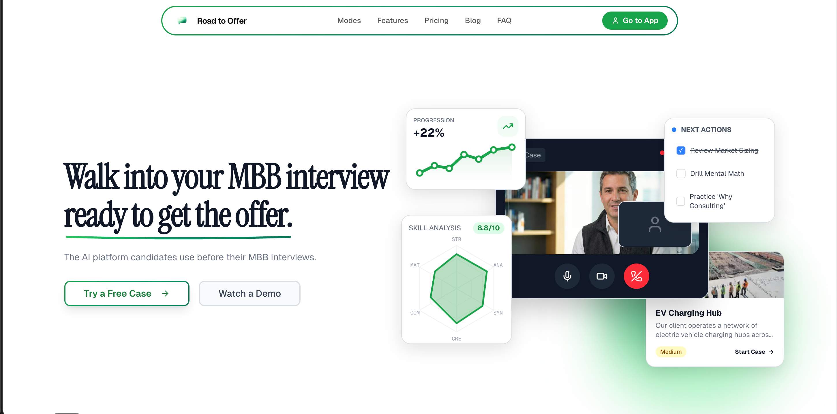 Road to Offer is an AI platform for McKinsey, BCG, and Bain case interview prep. It provides a realistic, 24/7 AI interviewer, eliminating scheduling and inconsistent feedback. Three modes (Learning, Guided, Voice) cater to all skill levels, with Voice offering full conversational simulation. Post-case, detailed debriefs score 7 categories using the RRRN framework. The platform also features 6 infinite drill types, an analytics dashboard for skill tracking, and a club system.