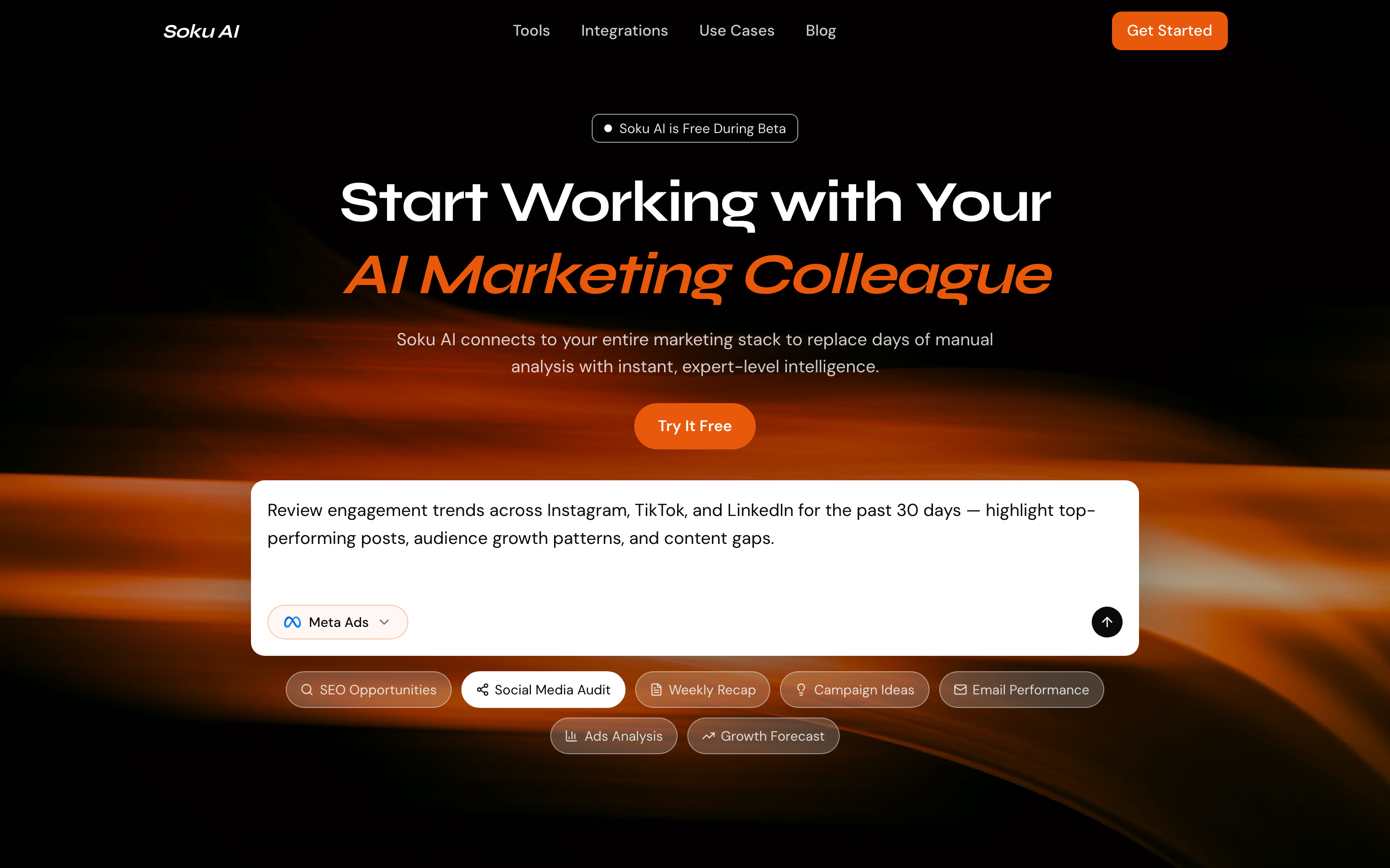 Soku AI is an autonomous marketing agent that runs ads, SEO, social media