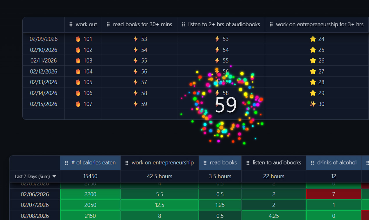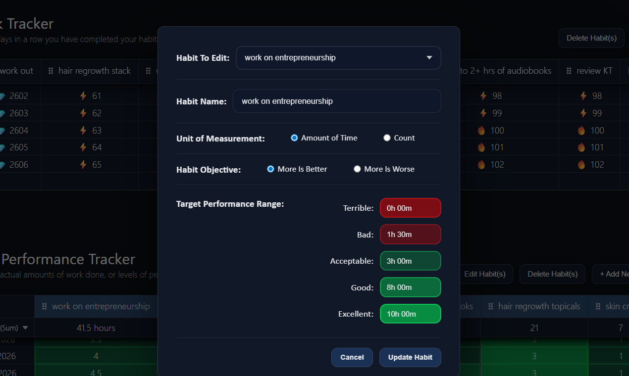 The Super Simple Habit Tracker is a web-based tool designed to make consistency visible and performance measurable. It combines consecutive-day streak tracking with quantified daily output, allowing users to log real work β time spent or counts completed β and compare results against self-defined performance targets. Clear visual feedback shows instantly whether youβre meeting your standards or falling short. All habits live in one place, giving you an at-a-glance snapshot across the areas of life that matter most. You can track positive habits you want to grow and negative habits you want to reduce, turning the tool into a single source of truth for personal accountability. By pairing streak momentum with measurable performance, the tracker helps users stay consistent, identify weak spots, and steadily improve across multiple areas without the clutter or friction of complex apps.