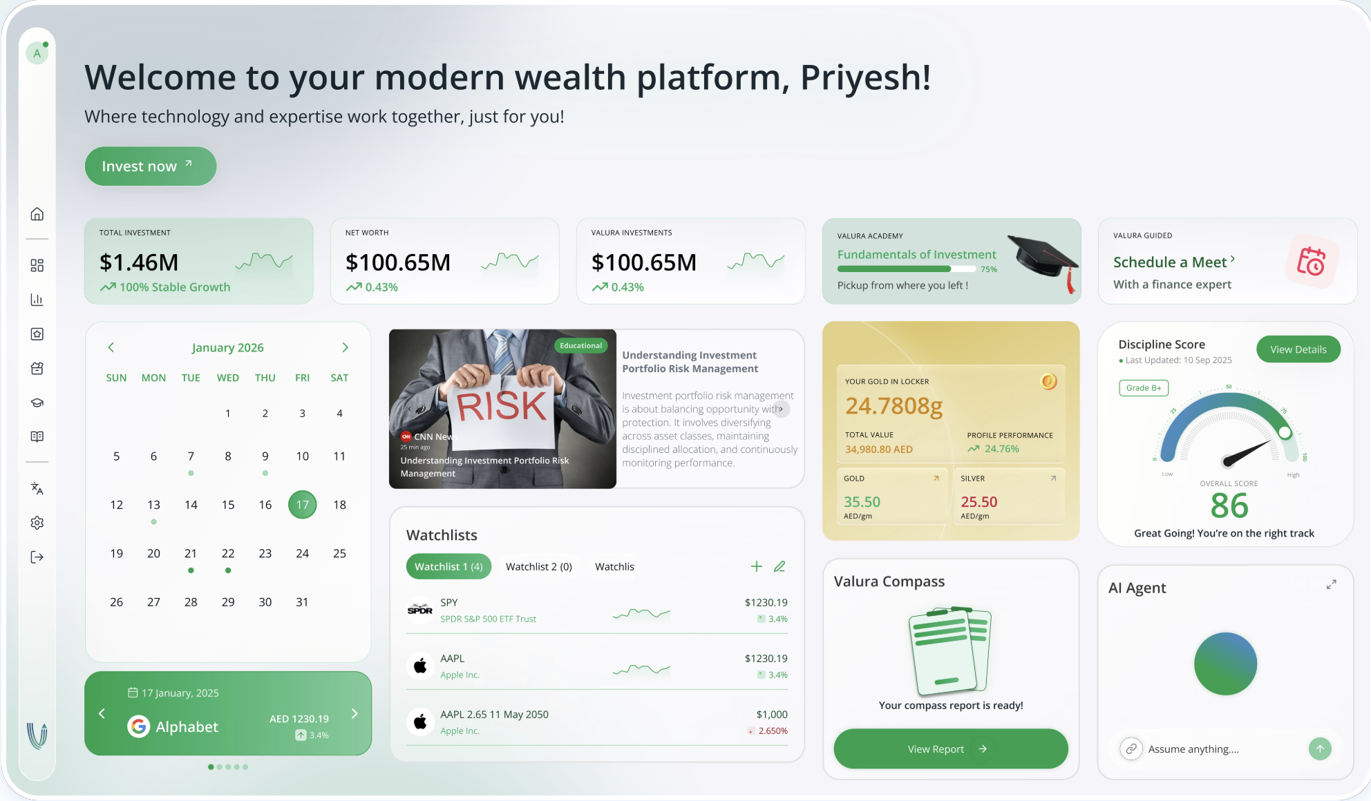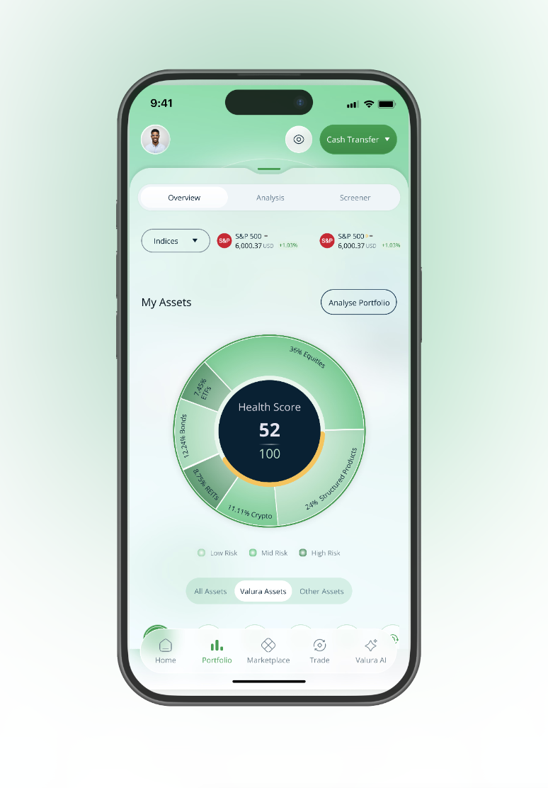 Valura.ai is a client-facing wealth platform built to simplify investing end-to-end—from planning to execution to monitoring. We solve three core frictions: high minimum ticket sizes, confusing product choices, and fragmented accounts across multiple providers. Valura enables fractional participation through regulated micro-units, guides users with a quantified goal-based roadmap (monthly targets, risk level, and product mix), and consolidates visibility and control through a single command center that can connect to multiple brokers and custodians (read—and with permission—act). The result is a simpler, more disciplined investing experience designed for modern investors.