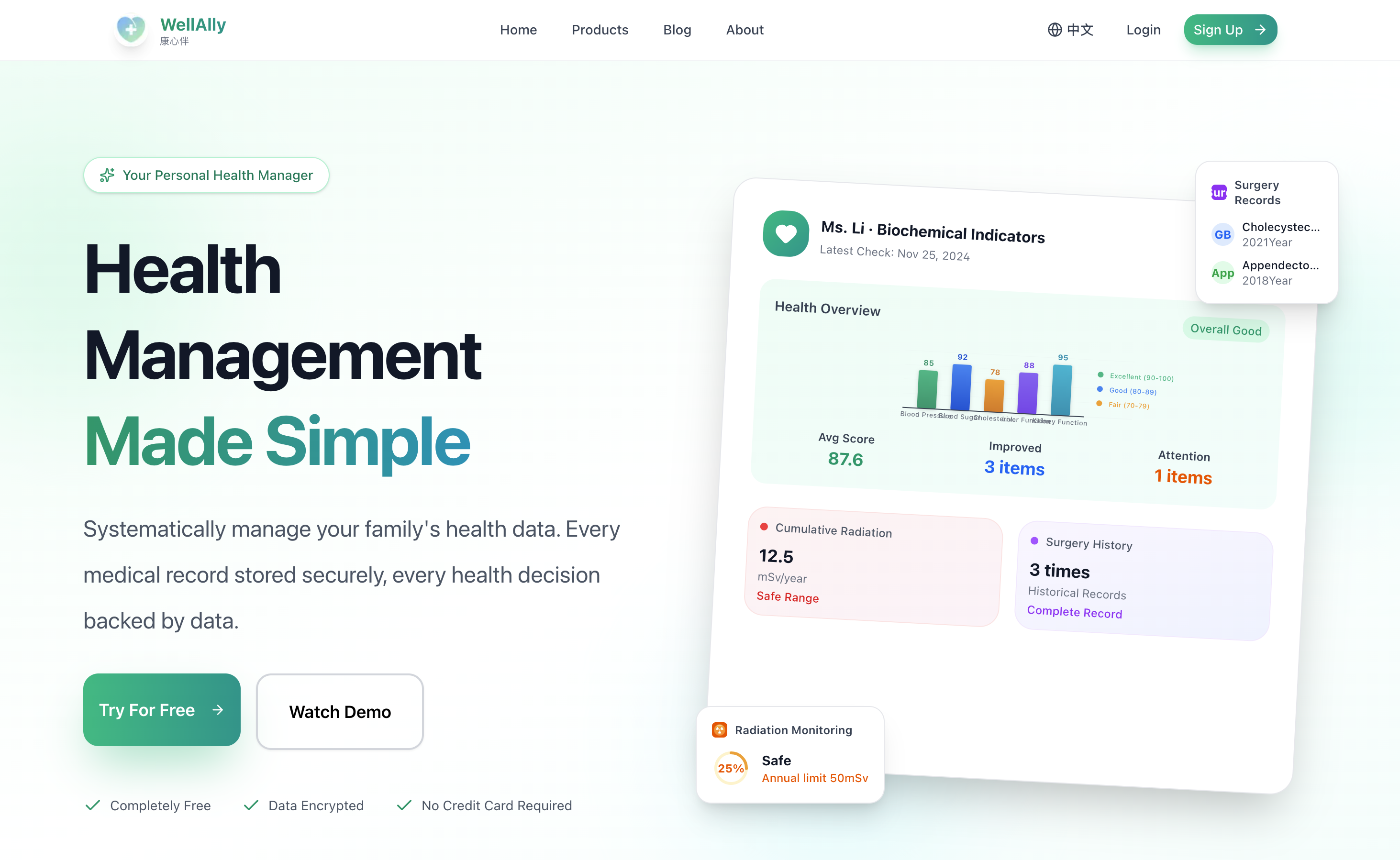 WellAlly is a non-diagnostic personal and family health data management platform. It helps people organize, track, and understand their health records over time — from lab results and imaging reports to medications and daily health signals — so they can make more informed decisions and communicate better with healthcare professionals.